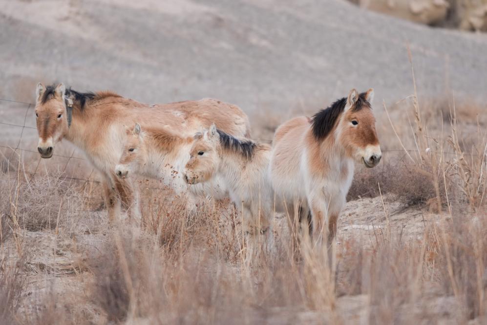 這是在甘肅敦煌西湖國(guó)家級(jí)自然保護(hù)區(qū)內(nèi)拍攝的普氏野馬和小馬駒。新華社記者郎兵兵 攝