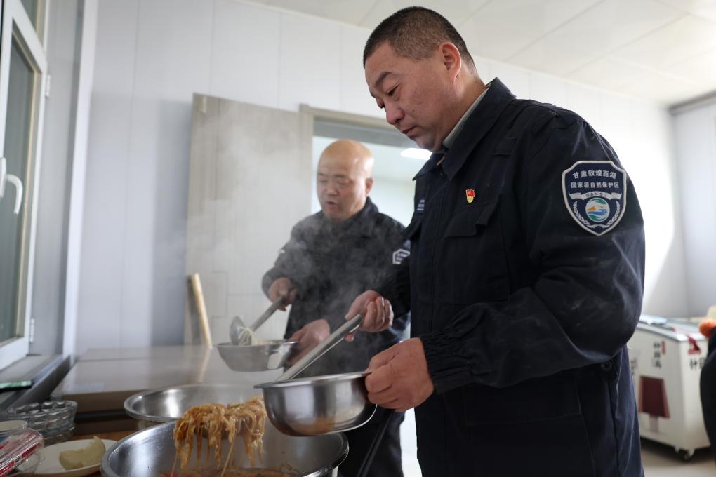 這是吳興東(右)和同事在巡護(hù)結(jié)束后,回到站里吃飯。新華社記者陳斌 攝