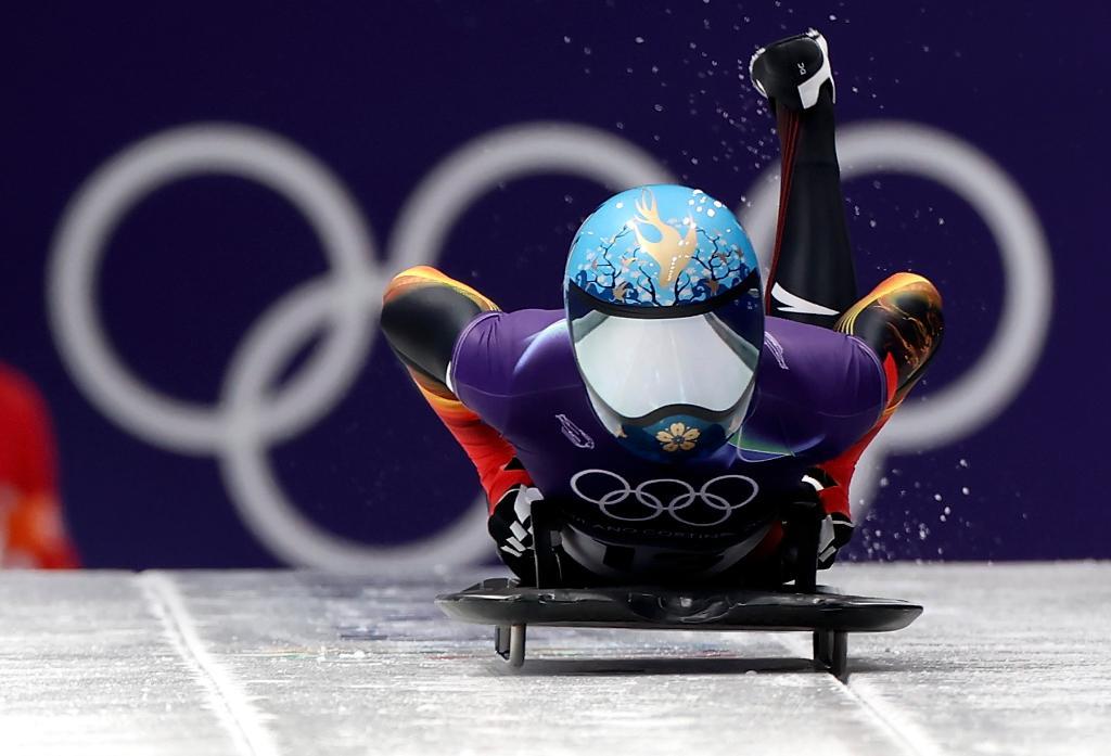 2月13日,中國(guó)選手趙丹在鋼架雪車(chē)女子單人賽第一輪比賽中出發(fā)。新華社記者 丁旭 攝