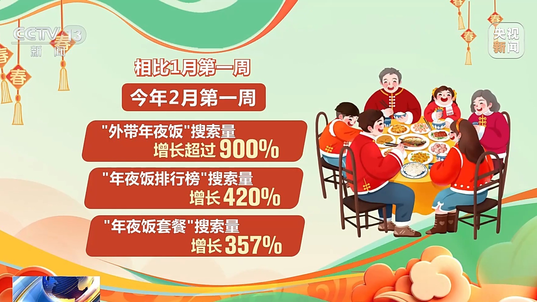 數(shù)據(jù)顯示,相比1月第一周,今年2月第一周“外帶年夜飯”搜索量增長超過900%,“年夜飯排行榜”搜索量增長420%,“年夜飯?zhí)撞汀彼阉髁吭鲩L357%。