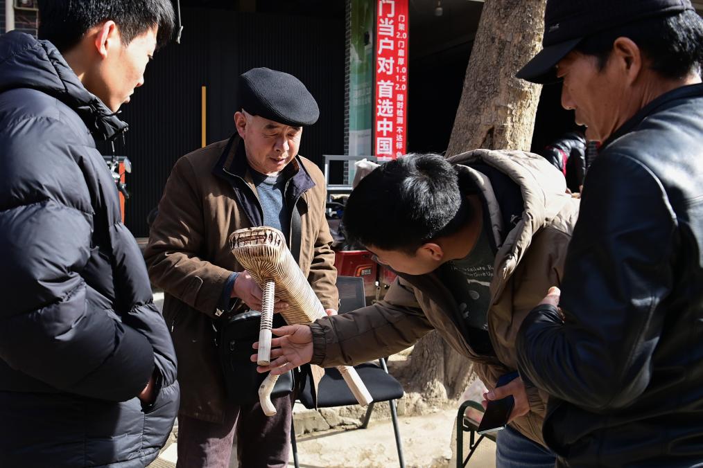 2月13日,李學(xué)員(左二)在焦岱大集上向顧客介紹自制的手工凳子。新華社記者鄒競一 攝