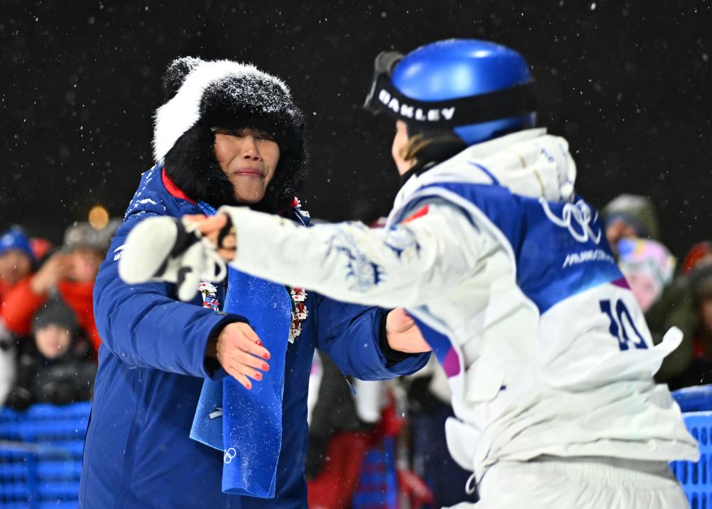 2月16日,中國(guó)選手谷愛凌(右)與在場(chǎng)邊的母親擁抱。新華社記者 張宏祥 攝