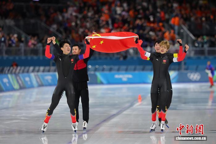 當?shù)貢r間2月17日,在意大利米蘭舉行的米蘭冬奧會速度滑冰男子團體追逐B(yǎng)組決賽中,中國隊戰(zhàn)勝荷蘭隊,收獲銅牌。圖為中國隊運動員在賽后慶祝。中新社記者 駱云飛 攝
