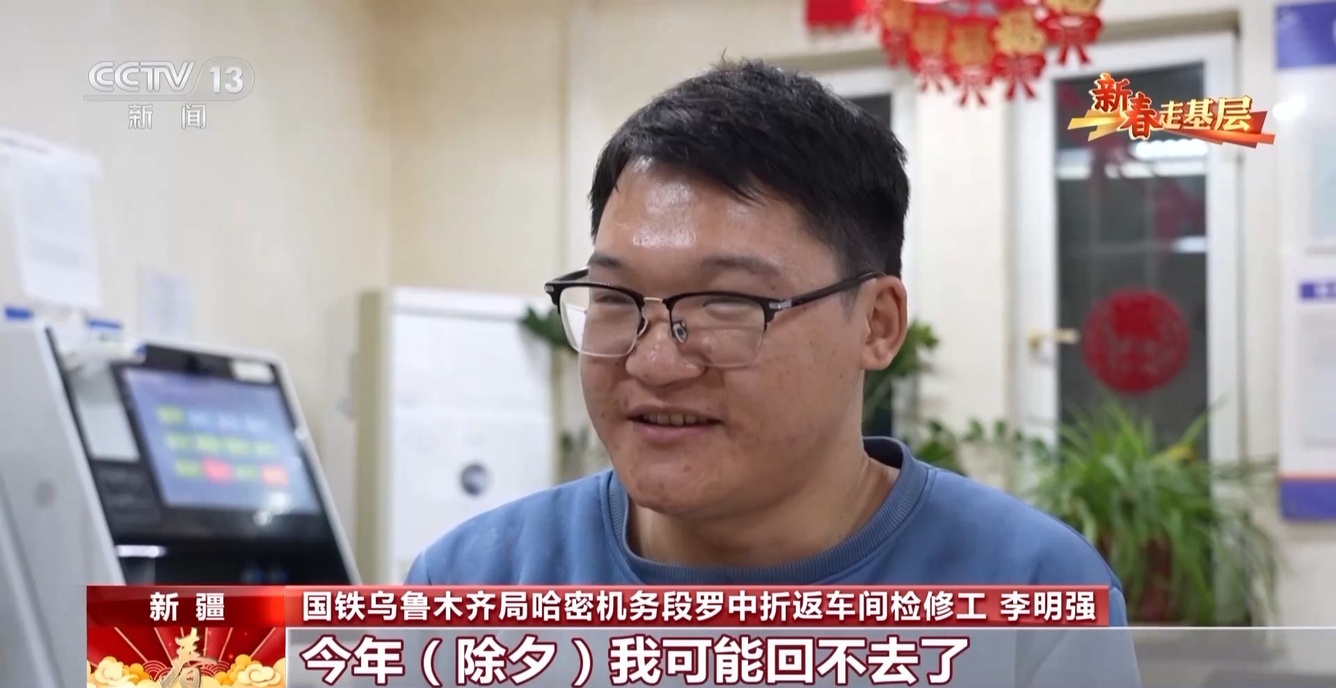 國(guó)鐵烏魯木齊局哈密機(jī)務(wù)段羅中折返車(chē)間檢修工 李明強(qiáng):爸、媽?zhuān)瑑鹤釉谶@給您拜年了。今年除夕我可能回不去了,但是你放心。大漠戈壁也是另一種風(fēng)景,羅布泊有平時(shí)看不見(jiàn)的星空,落日也非常漂亮。在這里走好自己的每一步,就是對(duì)我們西部更好的一個(gè)發(fā)展。我覺(jué)得我的青春能在這里綻放出更加絢麗的色彩。