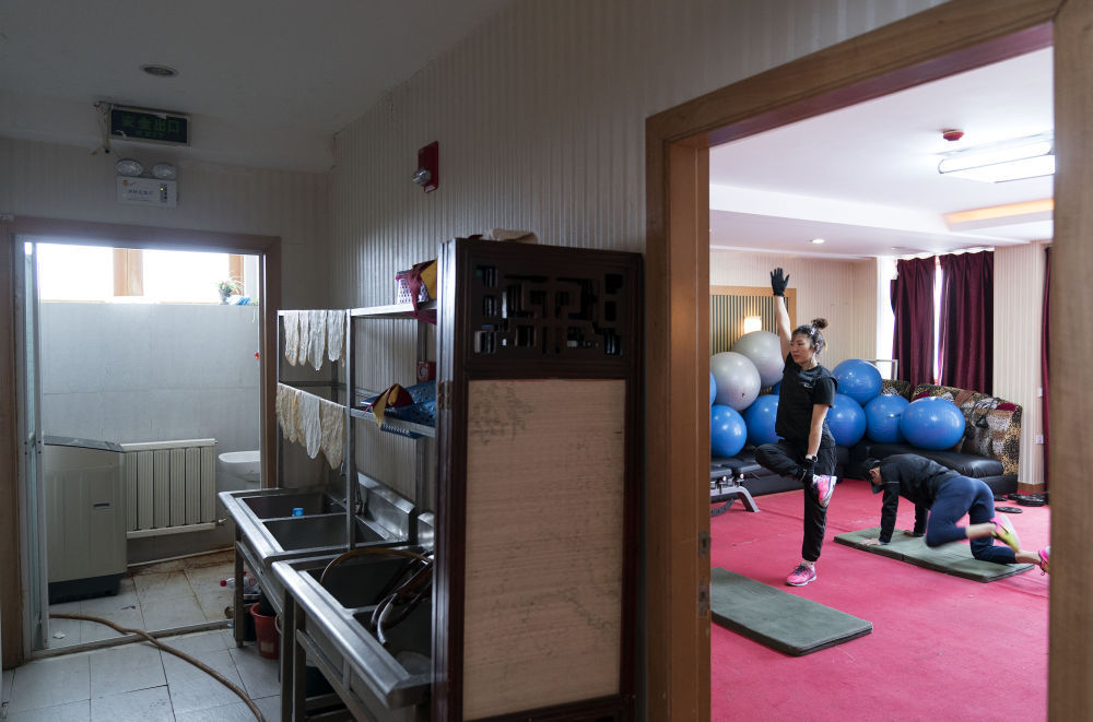 2017年12月4日清晨,徐夢桃(左)和王心迪在杠鈴房里熱身。新華社記者 費茂華 攝