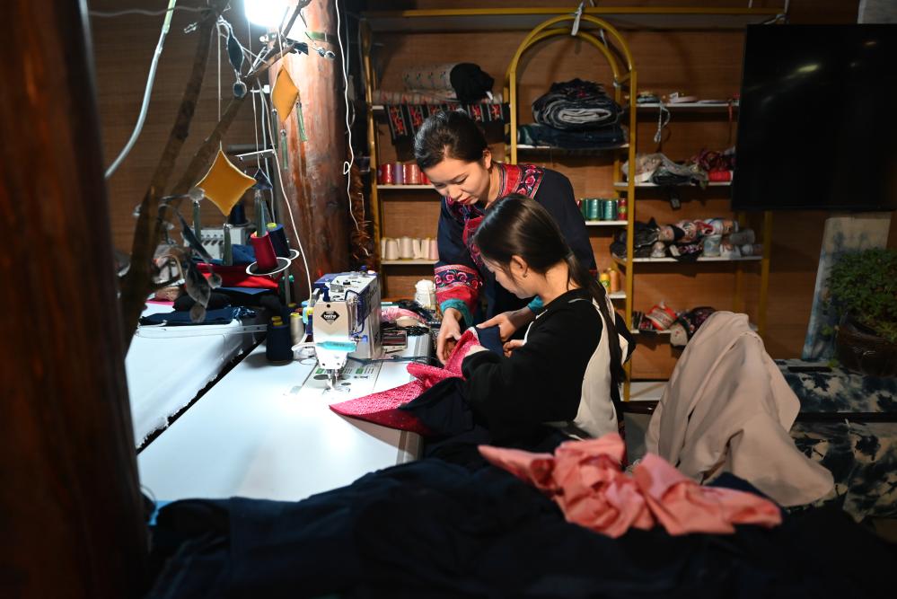 李利(后)在貴州省興義市萬峰林景區(qū)門店內與員工一起制作民族服飾(2024年2月19日攝)。新華社記者 劉續(xù) 攝