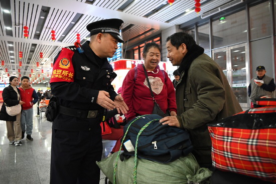 圖為林芳德在站廳內(nèi)向旅客講解出行安全注意事項。