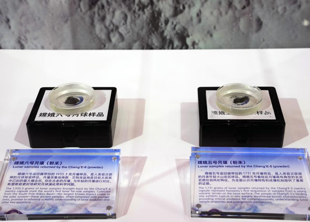 2025年11月5日在第八屆進博會國家展中國館拍攝的嫦娥五號月壤和嫦娥六號月壤。新華社記者 劉穎 攝