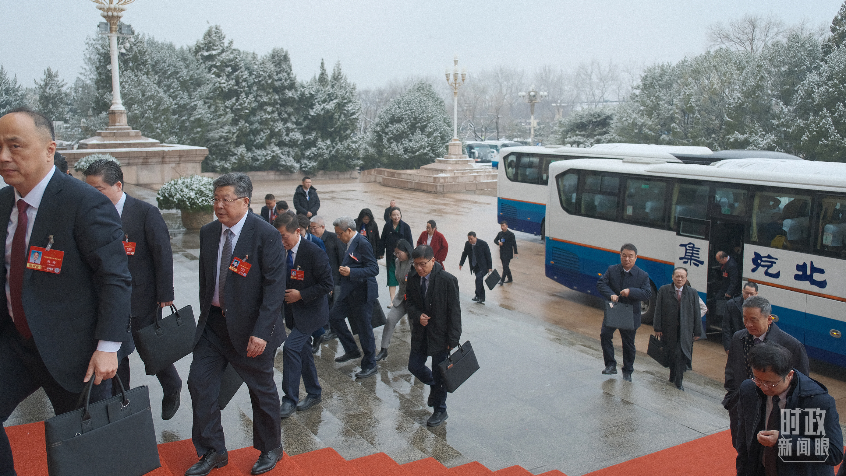 △江蘇代表團(tuán)乘車前往人民大會堂。(總臺記者黃成拍攝)