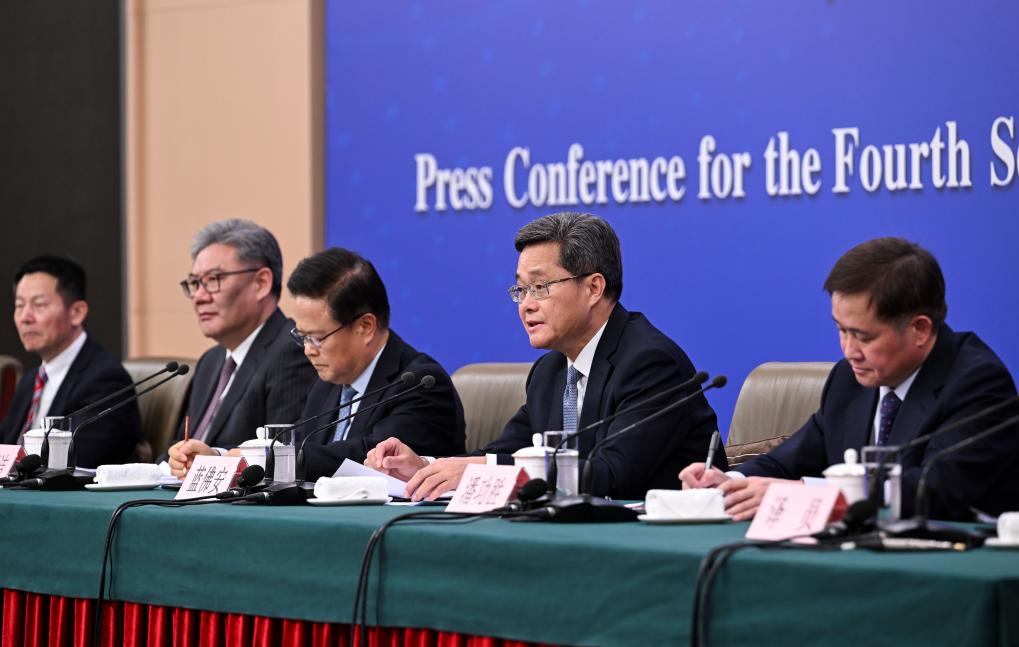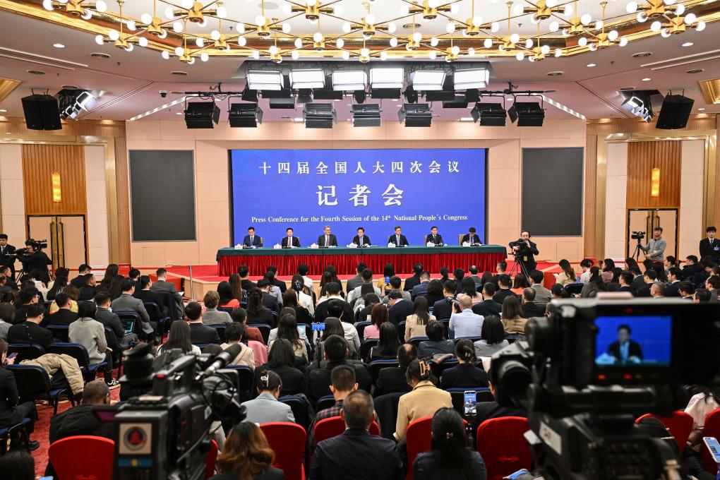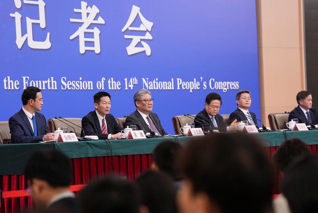 3月6日,十四屆全國人大四次會議在北京梅地亞中心新聞發(fā)布廳舉行記者會。國家發(fā)展和改革委員會主任鄭柵潔、財政部部長藍佛安、商務(wù)部部長王文濤、中國人民銀行行長潘功勝、中國證券監(jiān)督管理委員會主席吳清就發(fā)展改革、財政預(yù)算、商務(wù)、金融證券等相關(guān)問題回答中外記者提問。新華社記者 王曦 攝