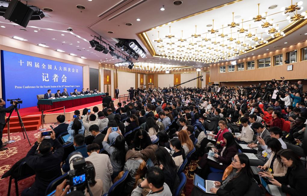 3月6日,十四屆全國人大四次會議在北京梅地亞中心新聞發(fā)布廳舉行記者會。國家發(fā)展和改革委員會主任鄭柵潔、財政部部長藍佛安、商務(wù)部部長王文濤、中國人民銀行行長潘功勝、中國證券監(jiān)督管理委員會主席吳清就發(fā)展改革、財政預(yù)算、商務(wù)、金融證券等相關(guān)問題回答中外記者提問。這是記者舉手提問。新華社記者 李鑫 攝