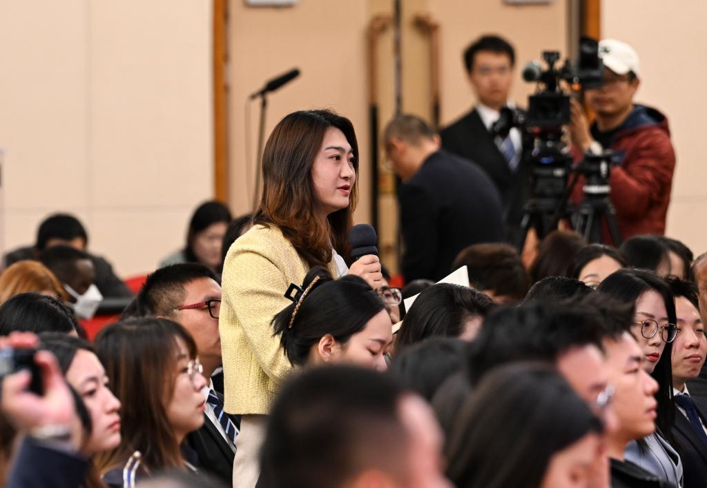3月6日,十四屆全國人大四次會議在北京梅地亞中心新聞發(fā)布廳舉行記者會。國家發(fā)展和改革委員會主任鄭柵潔、財政部部長藍佛安、商務(wù)部部長王文濤、中國人民銀行行長潘功勝、中國證券監(jiān)督管理委員會主席吳清就發(fā)展改革、財政預(yù)算、商務(wù)、金融證券等相關(guān)問題回答中外記者提問。這是記者在提問。新華社記者 曹祎銘 攝