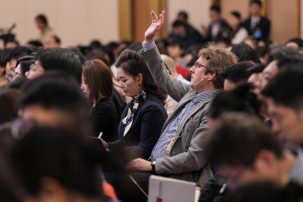 3月6日,十四屆全國人大四次會議在北京梅地亞中心新聞發(fā)布廳舉行記者會。國家發(fā)展和改革委員會主任鄭柵潔、財政部部長藍佛安、商務(wù)部部長王文濤、中國人民銀行行長潘功勝、中國證券監(jiān)督管理委員會主席吳清就發(fā)展改革、財政預(yù)算、商務(wù)、金融證券等相關(guān)問題回答中外記者提問。這是記者舉手提問。新華社記者 王曦 攝