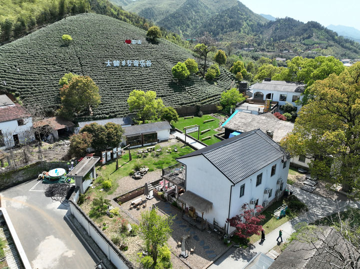 在浙江省安吉縣上墅鄉(xiāng)上墅村,茶山和一個(gè)鄉(xiāng)村文旅項(xiàng)目結(jié)合在一起(2024年4月9日攝,無人機(jī)照片)。新華社記者 翁忻旸 攝