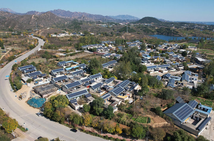 河北省平山縣西柏坡鎮(zhèn)北莊村兆瓦級(jí)“光儲(chǔ)”智能微電網(wǎng)示范工程項(xiàng)目中的屋頂光伏發(fā)電板(2025年11月2日攝,無人機(jī)照片)。新華社記者 楊世堯 攝