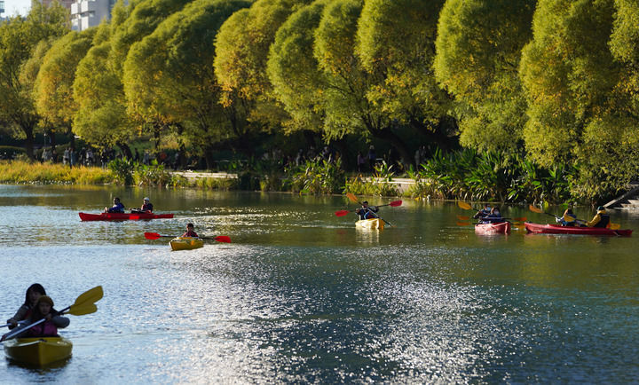 市民在北京亮馬河上體驗(yàn)皮劃艇(2022年10月22日攝)。新華社記者 陳鐘昊 攝