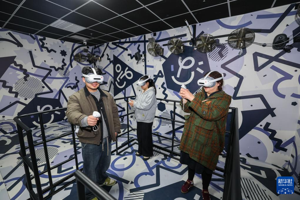 3月24日,在嘉興市南湖區(qū)“翼時(shí)空·嘉興1921”機(jī)遇時(shí)空體驗(yàn)館內(nèi),游客佩戴VR設(shè)備在虛擬場景中互動(dòng)體驗(yàn)。新華社記者 徐昱 攝