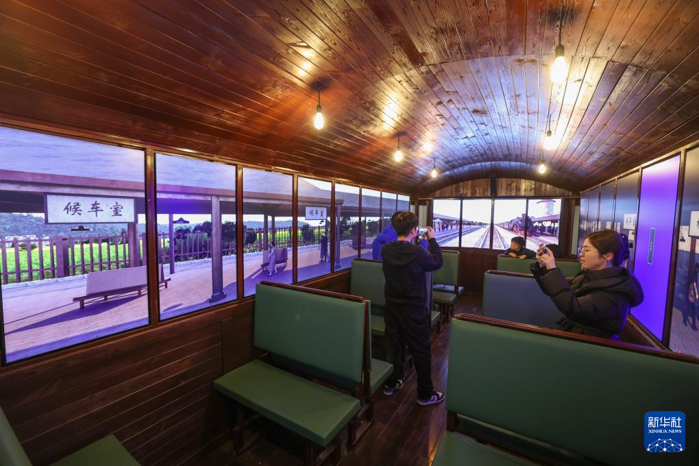 3月24日,游客在嘉興市南湖區(qū)“翼時(shí)空·嘉興1921”復(fù)古街區(qū)時(shí)光列車車廂里拍照打卡。新華社記者 徐昱 攝