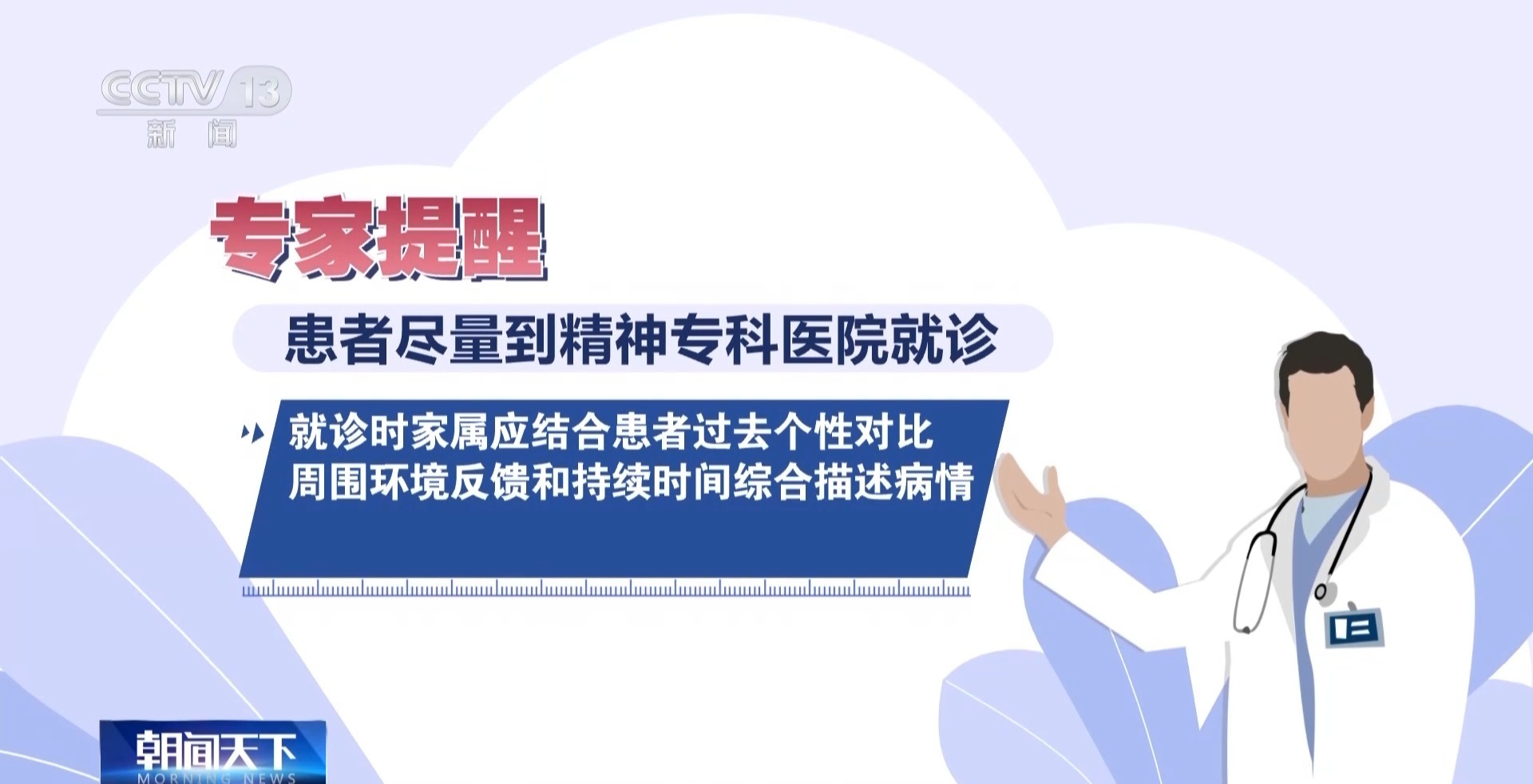 專家提醒,患者盡量到精神??漆t(yī)院就診,就診時(shí)家屬應(yīng)結(jié)合患者過去個(gè)性對(duì)比、周圍環(huán)境反饋和持續(xù)時(shí)間綜合描述病情,協(xié)助醫(yī)生準(zhǔn)確判斷病情。