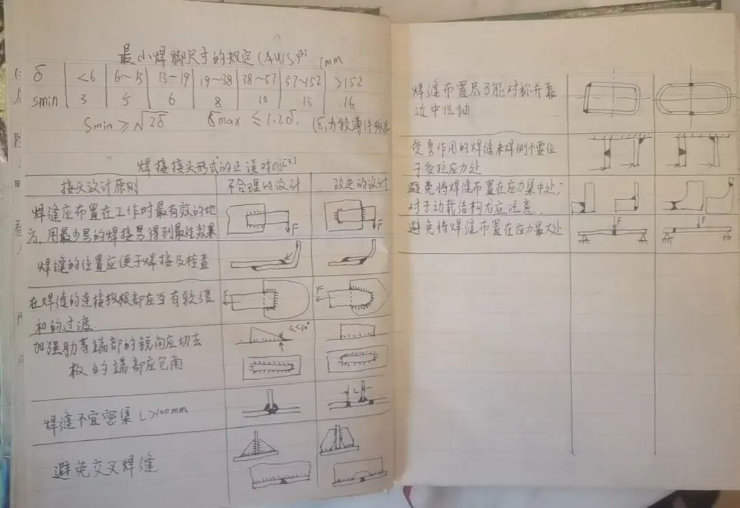 楊建立從兜里掏出一個(gè)封皮磨損、內(nèi)頁(yè)卷邊的筆記本,“這是我10年前的焊接筆記?!彼_一頁(yè),上面密密麻麻記錄著當(dāng)天的電流參數(shù)、氣溫、鋼材型號(hào),甚至還有一道焊縫的手繪示意圖。他把筆記本遞給前排的人傳閱。