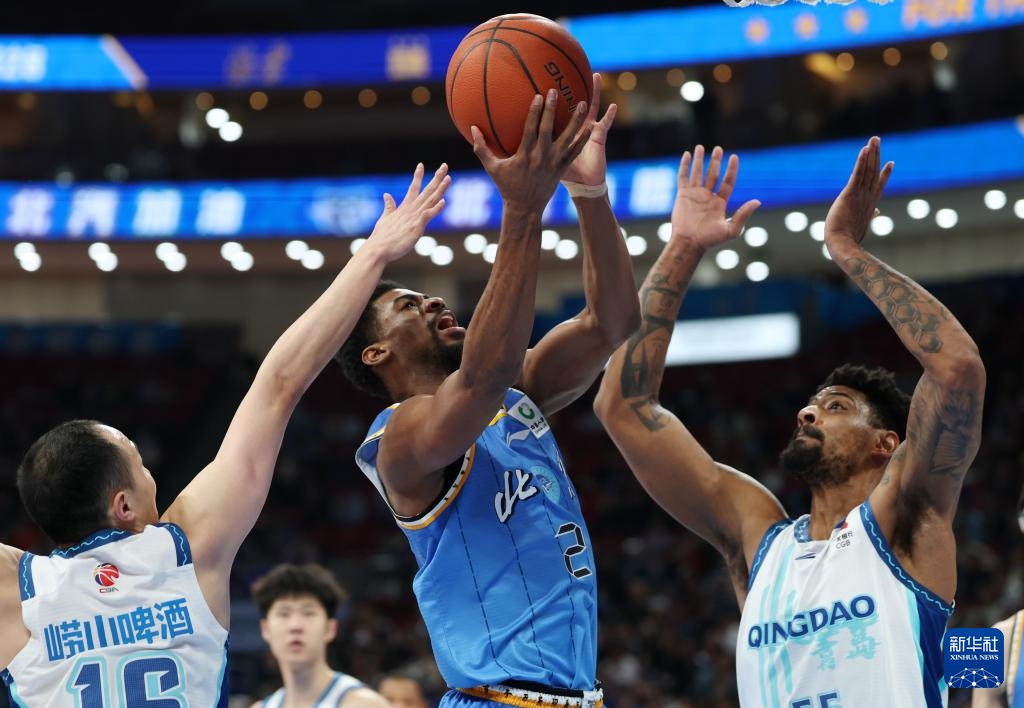 4月14日,青島嶗山啤酒隊球員韋瑟斯龐(中)進攻遭到北京北汽隊球員雷蒙(左)防守。新華社記者 張晨 攝