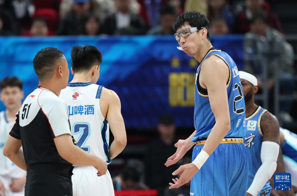 4月14日,北京北汽隊球員周琦(右)在比賽中與裁判交流。新華社記者 張晨霖 攝