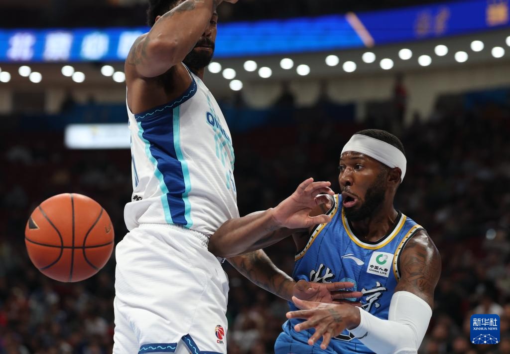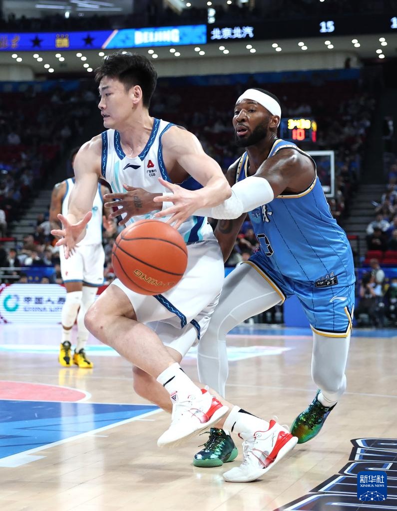 4月14日,北京北汽隊球員杰曼(右)在比賽中突破分球。新華社記者 張晨霖 攝