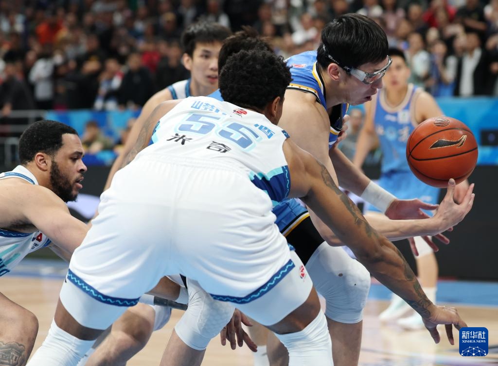 4月14日,北京北汽隊球員周琦(右一)在比賽中拼搶。新華社記者 張晨霖 攝