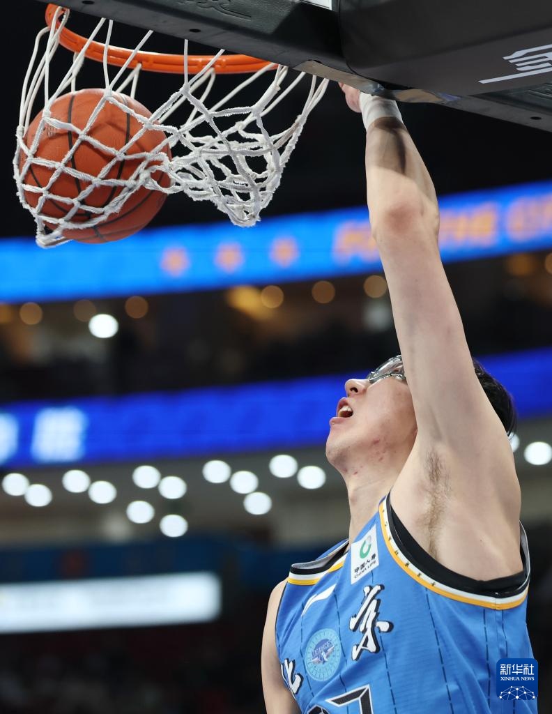 4月14日,北京北汽隊球員周琦在比賽中扣籃。新華社記者 張晨霖 攝