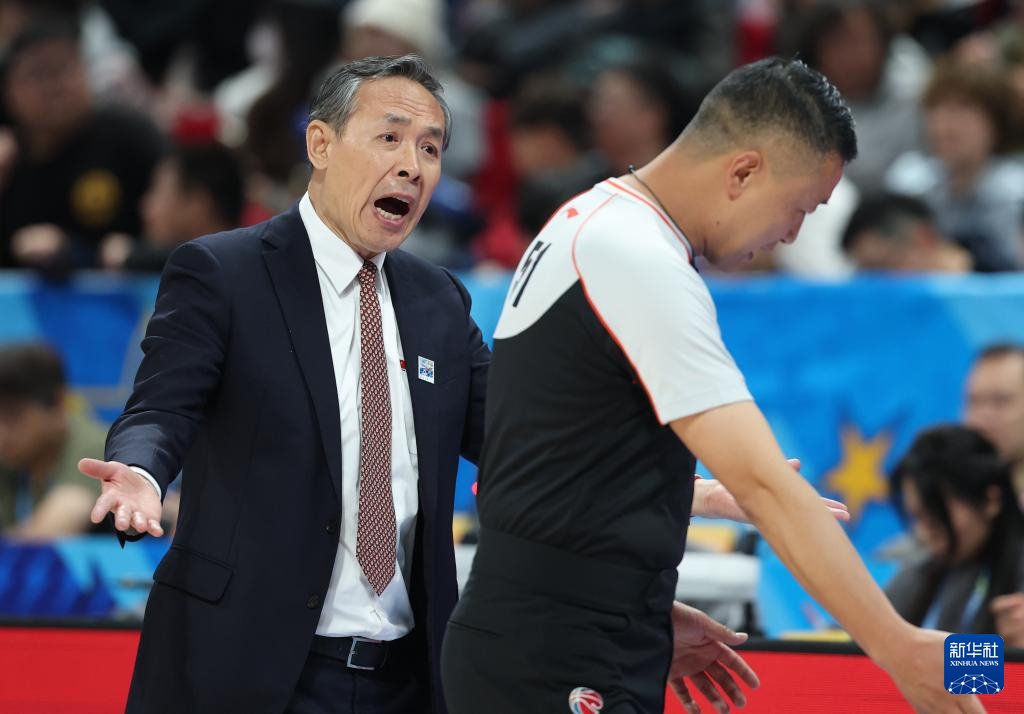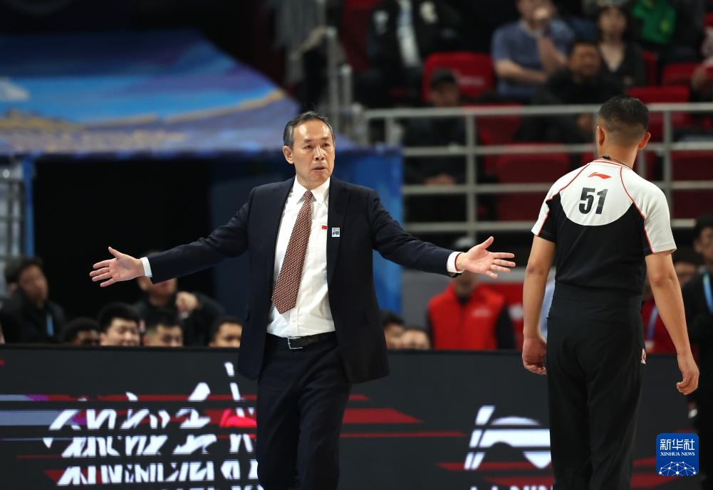 4月14日,北京北汽隊主教練許利民(左)在比賽中與裁判交流。新華社記者 張晨霖 攝