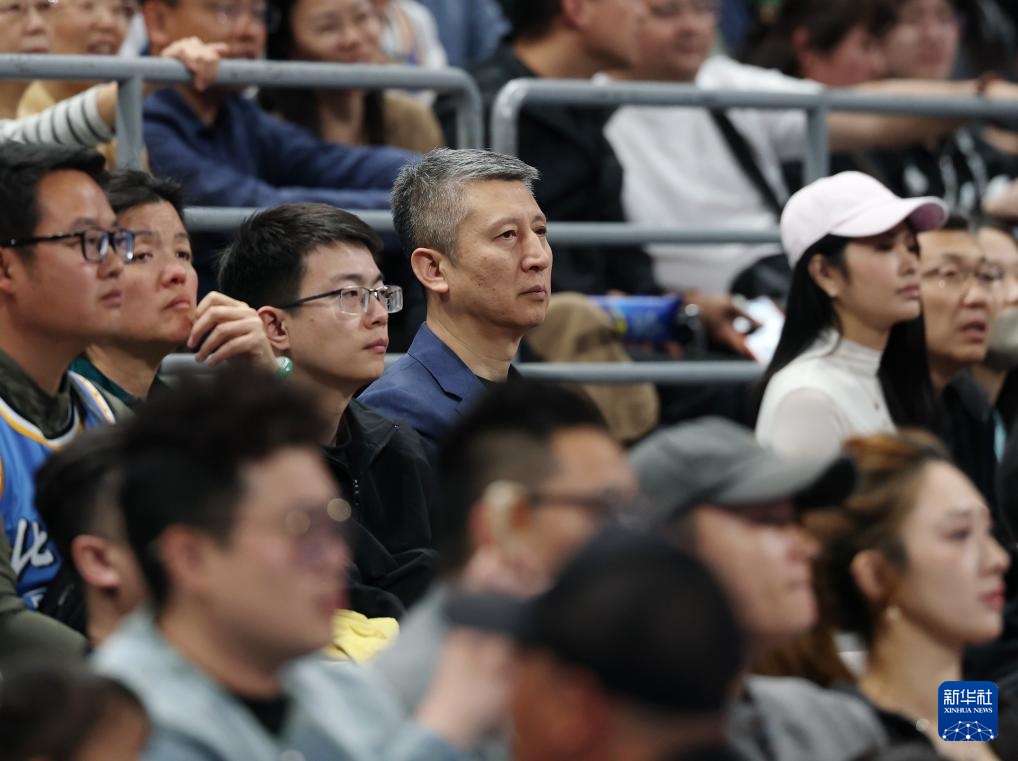 4月14日,中國國家男子籃球隊主教練郭士強(中)在看臺觀賽。新華社記者 張晨霖 攝