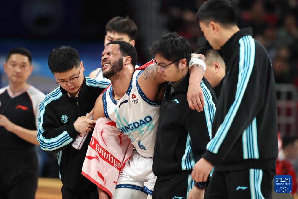 4月14日,青島嶗山啤酒隊球員韋瑟斯龐(中)在比賽中受傷后被攙扶下場。新華社記者 張晨 攝