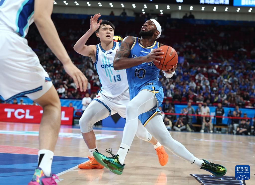 4月14日,青島嶗山啤酒隊球員王睿澤(左)進攻遭到北京北汽隊球員杰曼防守。新華社記者 張晨 攝