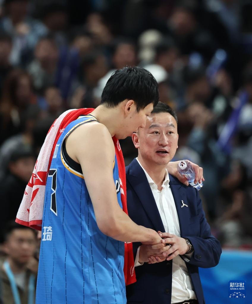 4月14日,青島嶗山啤酒隊主教練劉維偉(右)賽后與北京北汽隊球員周琦交談。新華社記者 張晨 攝