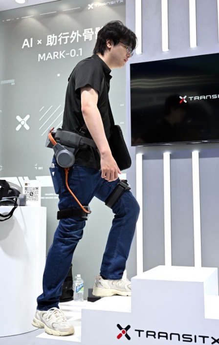 ↑ 4月14日,參觀者在第六屆消博會現(xiàn)場體驗(yàn)一款A(yù)I助行外骨骼。新華社記者 郭程 攝