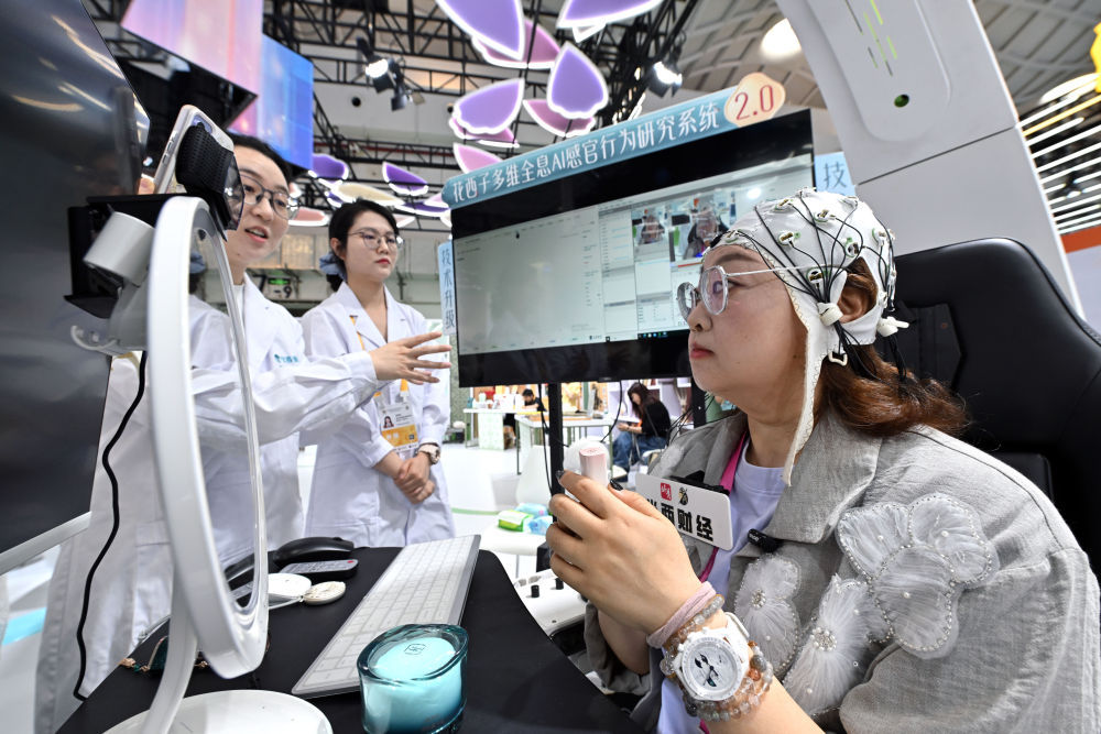 ↑ 4月14日,參觀者在第六屆消博會現(xiàn)場體驗(yàn)人工智能健康篩查系統(tǒng)。新華社記者 郭程 攝