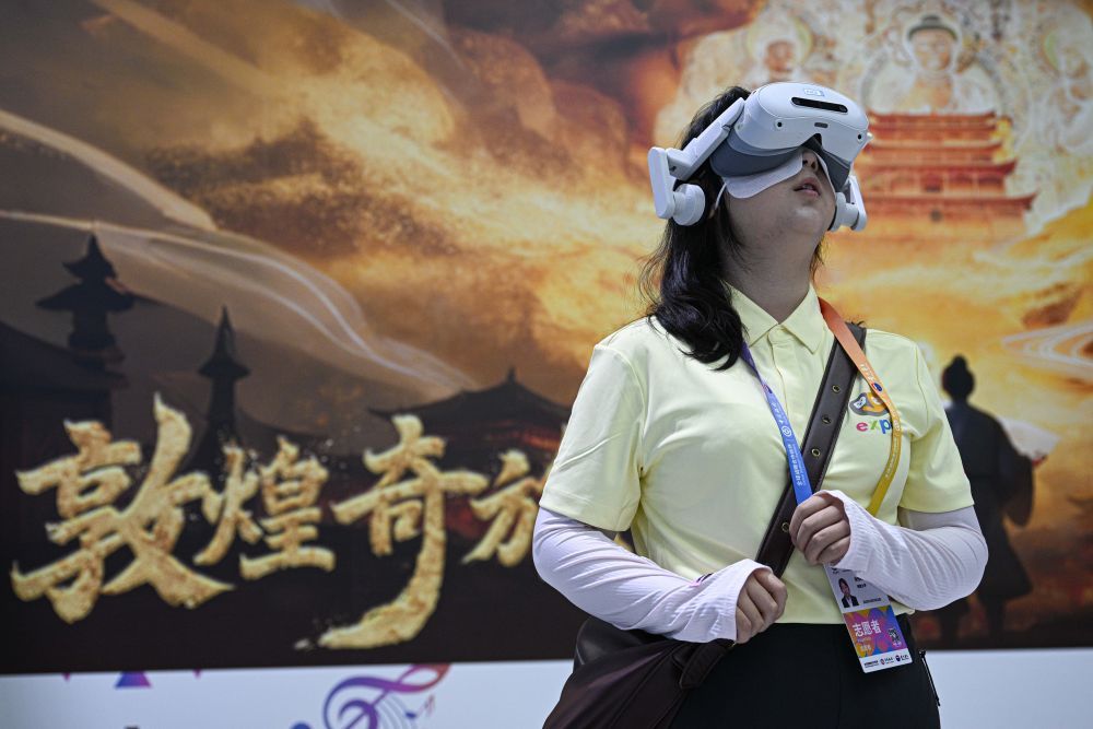 ↑ 4月14日,觀眾在第六屆消博會現(xiàn)場體驗(yàn)VR項(xiàng)目《敦煌奇旅》。新華社記者 蒲曉旭 攝