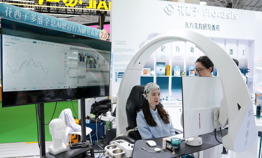 ↑ 4月14日,展商在消博會現(xiàn)場展示美妝多維全息AI感官行為研究系統(tǒng)。新華社記者 楊冠宇 攝