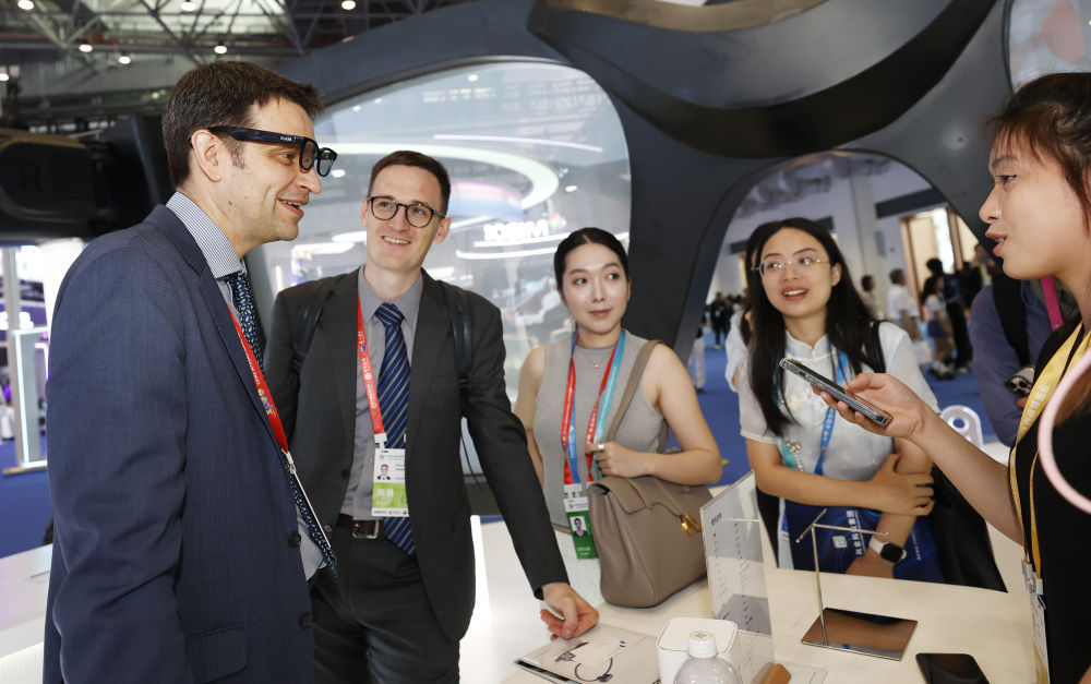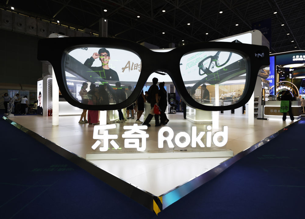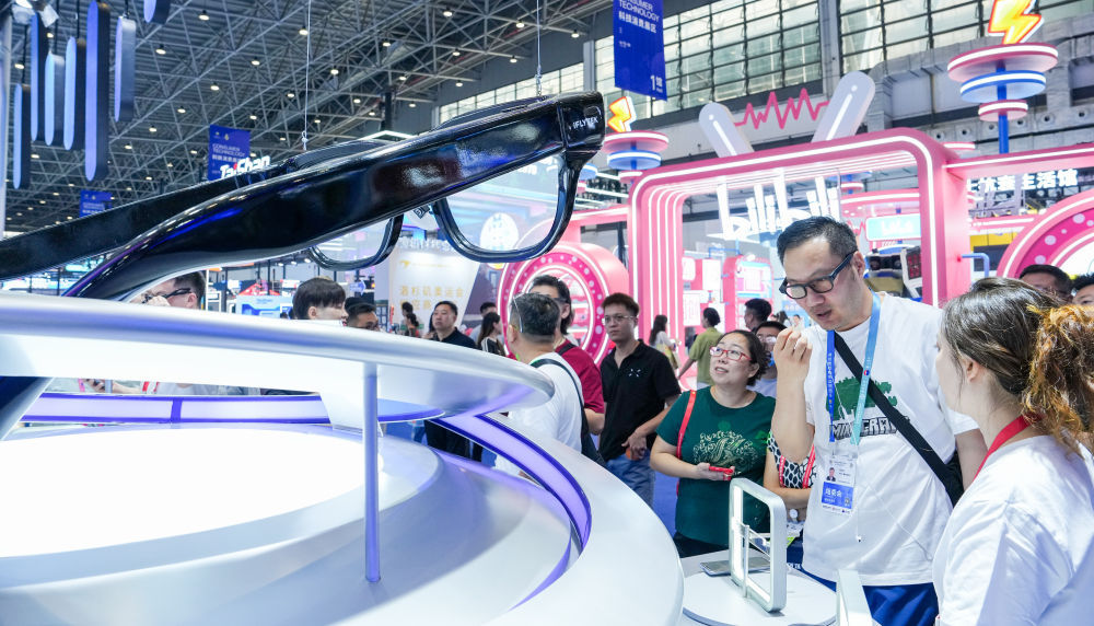 ↑ 4月14日,在第六屆消博會科技消費(fèi)展區(qū),人們參觀智能眼鏡品牌樂奇展臺。新華社記者 高靜 攝