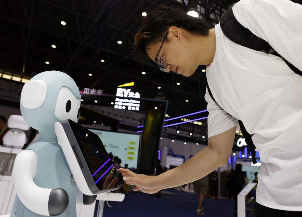 ↑ 4月14日,參觀者在第六屆消博會現(xiàn)場觀看AI陪伴機(jī)器人。新華社記者 郭程 攝