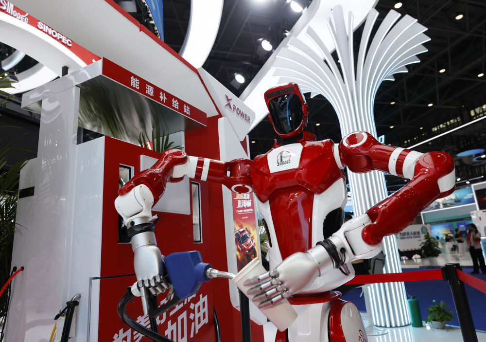 ↑ 4月14日,在第六屆消博會科技消費(fèi)展區(qū),中國石化展臺展示機(jī)器人加油。新華社記者 高靜 攝