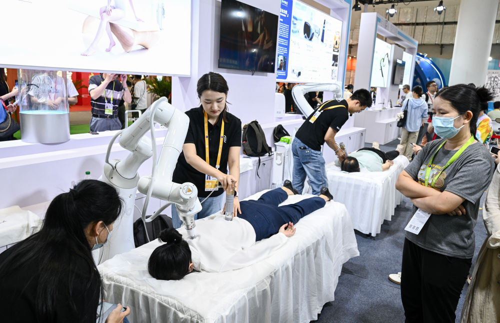 ↑ 4月14日,觀眾在第六屆消博會現(xiàn)場體驗(yàn)智能按摩機(jī)器人。新華社記者 楊冠宇 攝