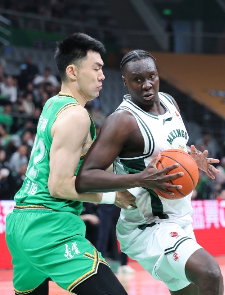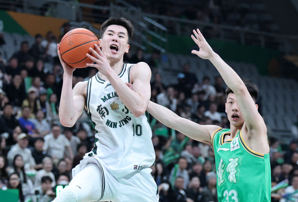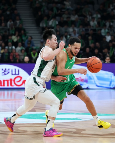 ↑ 遼寧本鋼隊球員李曉旭(左)在比賽中防守南京天之藍隊球員馬溫。新華社記者 李鋼 攝