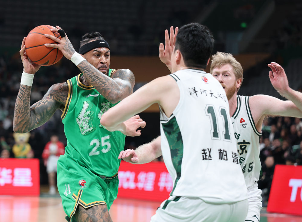 ↑ 遼寧本鋼隊球員李曉旭(右)、萊迪(上)在比賽中與南京天之藍隊球員郭昊文拼搶。新華社記者 李鋼 攝