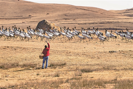 ?1月1日,在云南省昭通市大山包黑頸鶴國(guó)家級(jí)自然保護(hù)區(qū),守護(hù)黑頸鶴二十載的護(hù)鶴員陳光惠正給國(guó)家一級(jí)保護(hù)動(dòng)物黑頸鶴喂食。曾三東 攝
