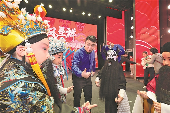 ⑨1月1日,天津,戲曲工作者正在說(shuō)戲。當(dāng)日,由華夏未來(lái)排演的少兒版開(kāi)年精品京劇《龍鳳呈祥》在華夏未來(lái)劇場(chǎng)成功上演。沈岳 攝