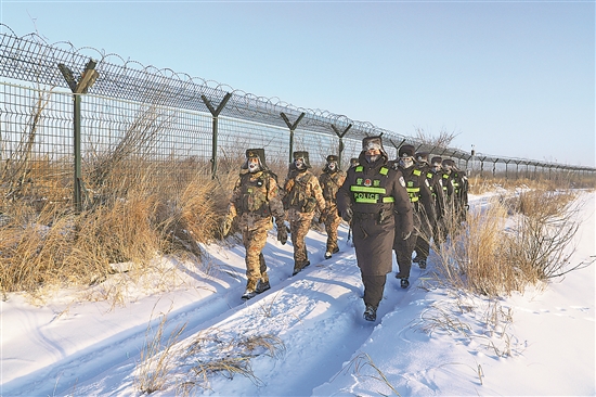?1月1日,執(zhí)勤民警與解放軍某連官兵在中俄界河額爾古納河我方一側(cè)聯(lián)合踏查。楊東升 攝