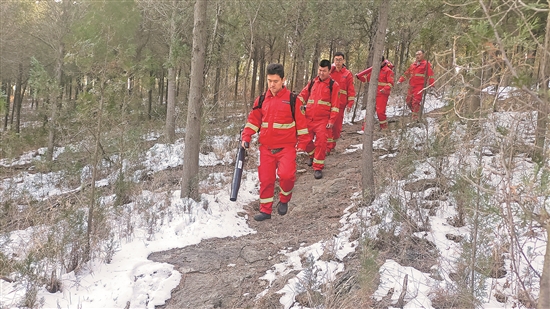 ⑦1月1日,山東省淄博市原山林場(chǎng)森林防火隊(duì)正在林間巡護(hù)。劉鑫哲 攝