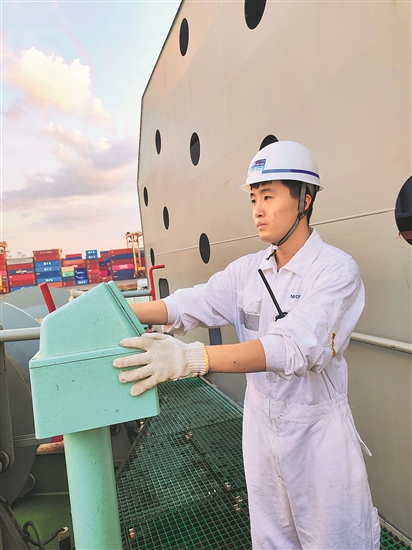 ④1月1日,“新明州102”輪于泰國(guó)當(dāng)?shù)貢r(shí)間18時(shí)靠泊泰國(guó)林查班港,甲板實(shí)習(xí)生在輔助大副進(jìn)行工作。李想 攝