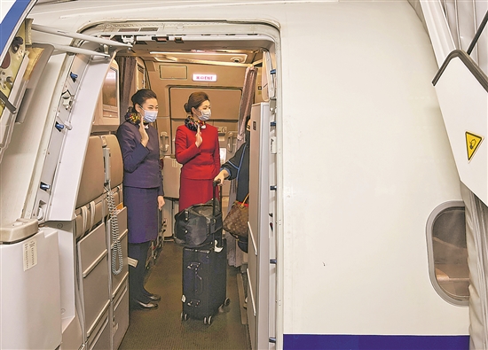 ⑥1月1日,廣東平潭—成都天府的CA2660航班落地,這趟新年早班航班的國(guó)航客艙乘務(wù)員,在機(jī)艙口為每一位旅客送上溫馨的新年祝福。尹鋼 攝